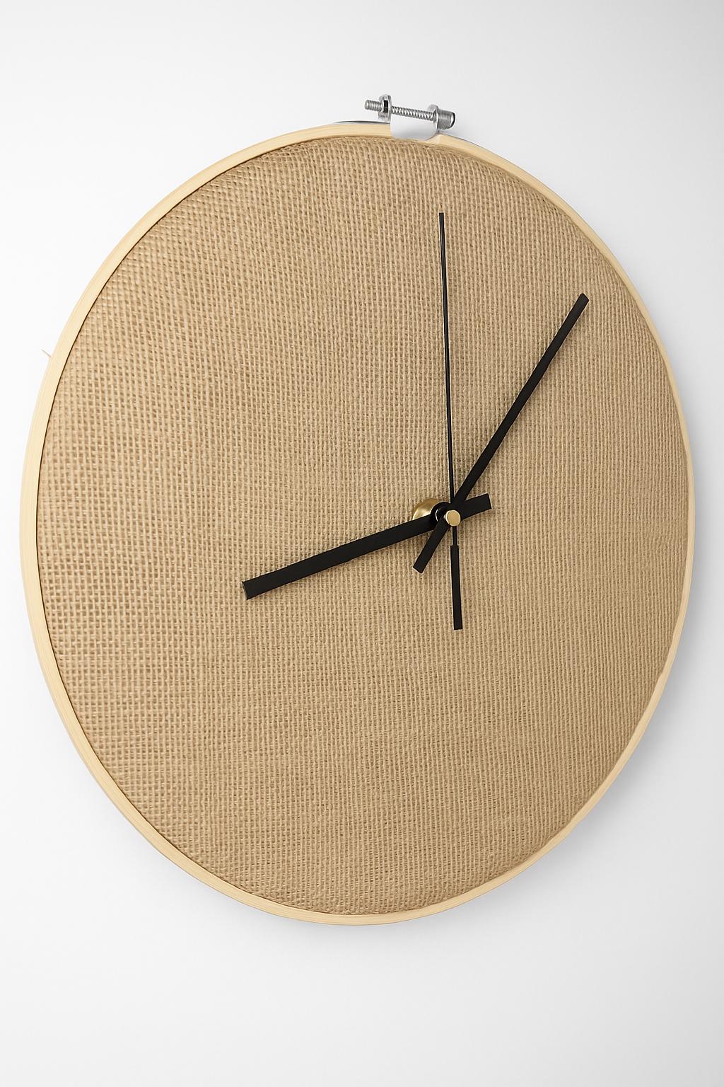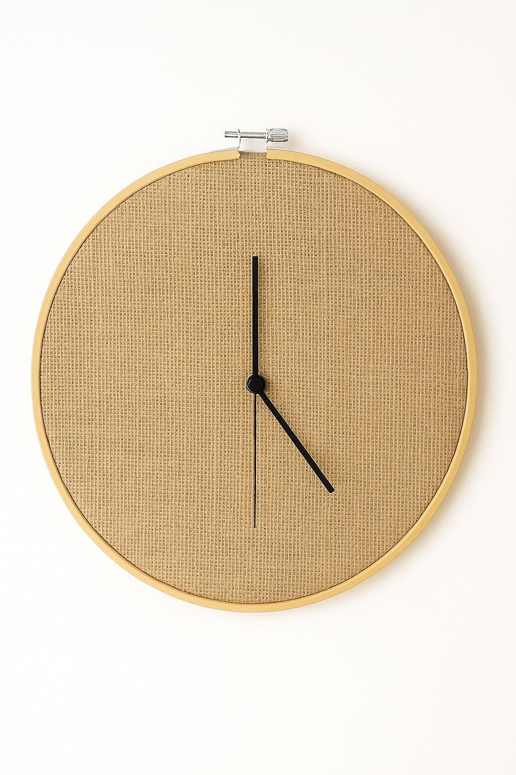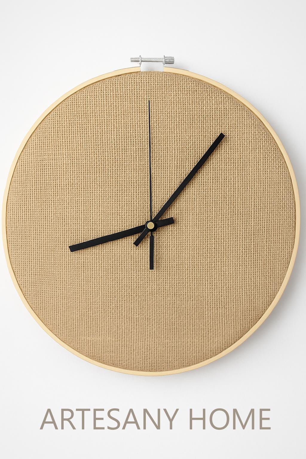 Material del fondo: esparto natural tejido Diámetro: 30 cm Manecillas: aluminio negro de alta calidad Diseño y confección: 100% artesanal en Madrid (España) Estilo: natural, rústico, minimalista, sostenible Mecanismo silencioso (sin tictac)