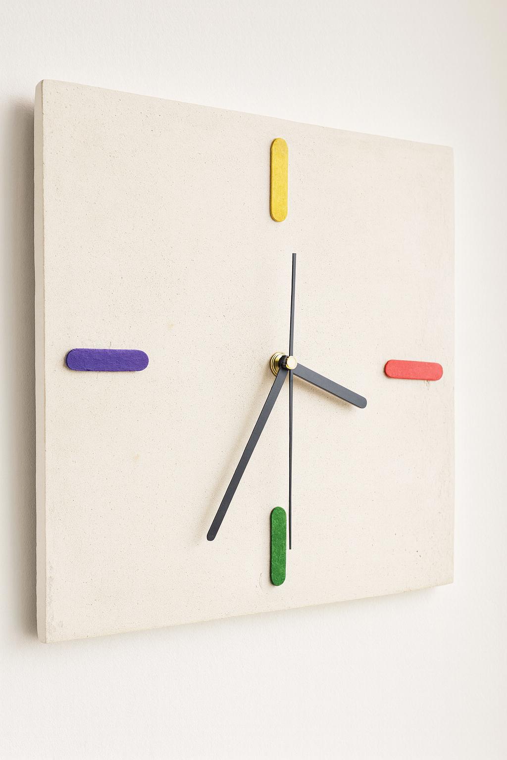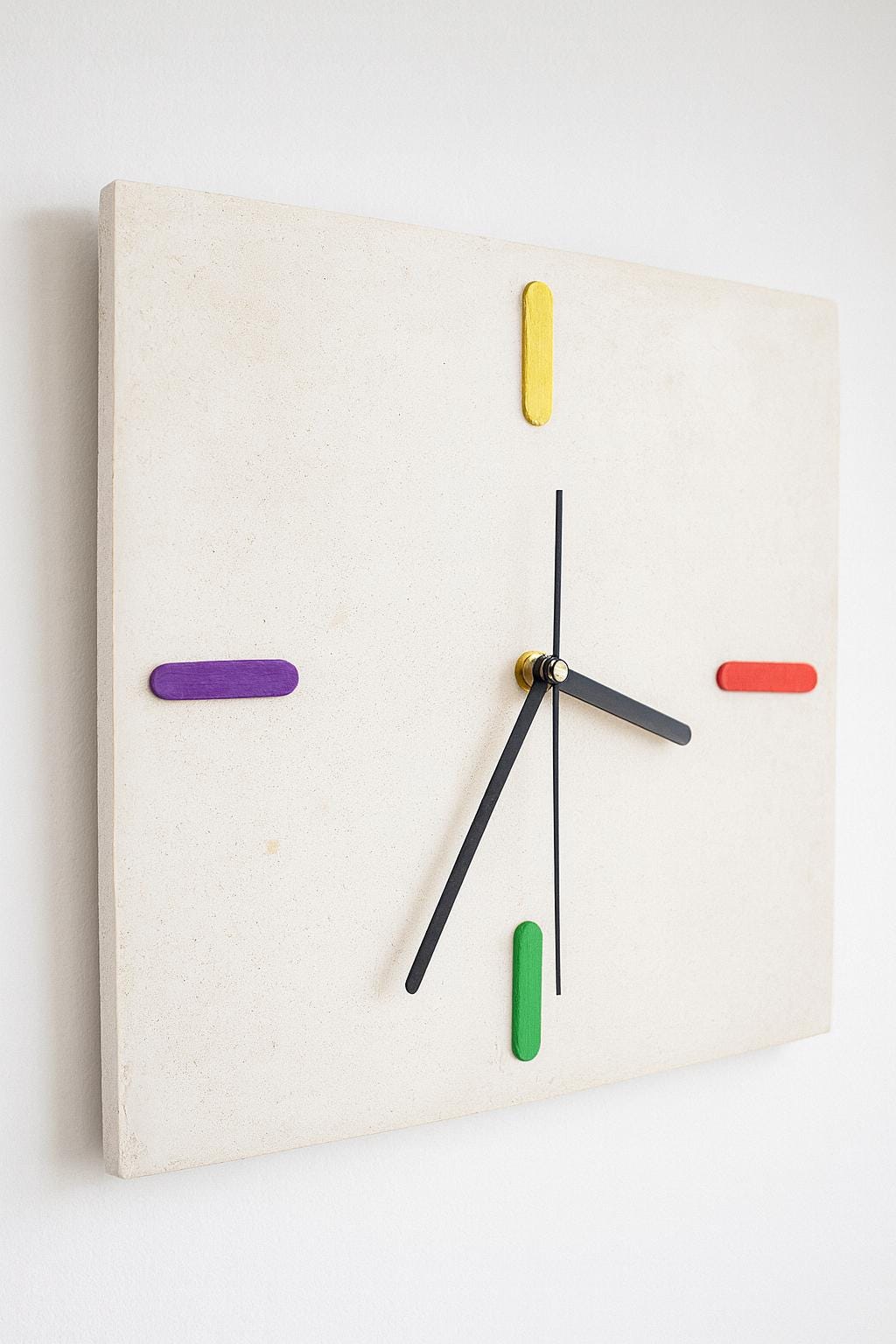 Material: High-quality handmade concrete Design: Minimalist, modern and colorful Markers: Natural wood, painted yellow, red, green, and purple (we have more colors) Hands: Black metal with a gold center (we have more colors of hands) Measurements: 25 cm x 25 cm Mounting: Easy wall installation Style: Nordic, modern, minimalist, handmade decor