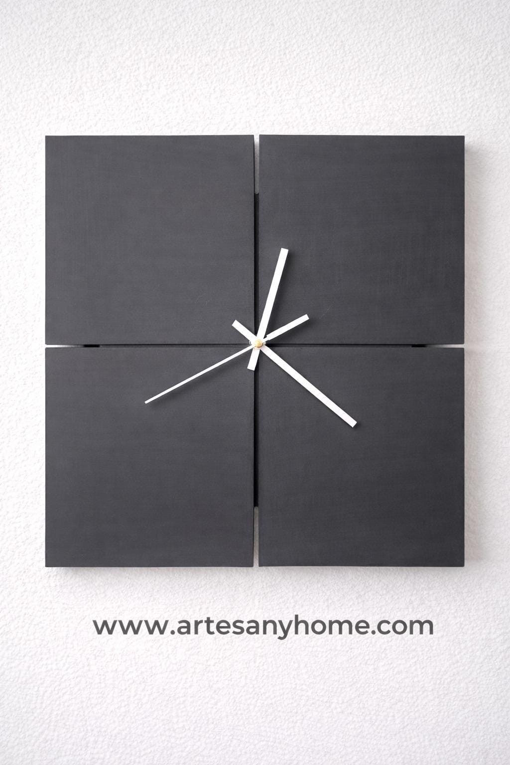 - Handmade square wall clock - Dimensions: 40 x 40 cm - Natural wood painted in chalk black - Possibility of changing the color to the buyer's liking - Modern and minimalist design - Handcrafted - Functional and durable decorative piece
